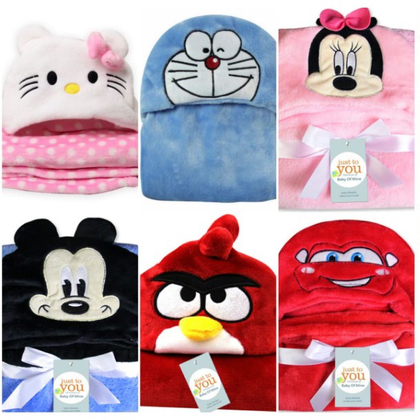 Selimut Bayi Topi Boneka Karakter Fleece Bahan Lembut dan Adem size 76X102CM/ Selimut Bulu Bayi Bahan Adem Dengan Topi Karakter Boneka Lucu